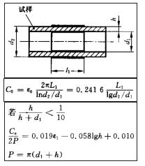 電極可選用5.1.3中任意一種。如果不用保護環(huán),而且試樣上下的兩個電極難以對齊時,其中一個電極應比另一個電極大些。已經加有電極的試樣應放置在兩個金屬電極之間,這兩個金屬電極要比試樣上的電極稍小些。對于平板形和圓柱形這兩種不同電極結構的電容計算公式以及邊緣電容近似計算的經驗公式由表1給出。