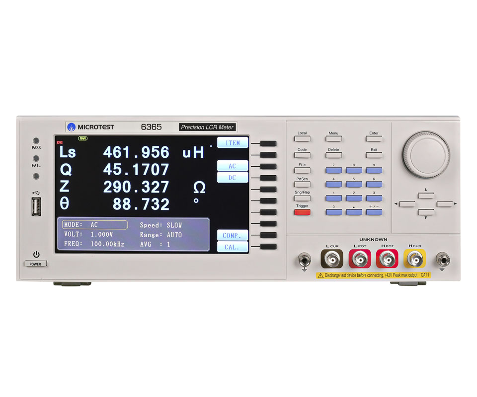 6365經(jīng)濟型 LCR 電橋具備高精確度、速度,且經(jīng)濟型多功能,測試頻率范圍從10Hz~200kHz?;揪_度±0.05%,螢幕畫面可以同時顯示四個參數(shù)。具多步列表功能,最多可以設定8組。低頻率6365A (0.1Hz~200kHz)可量測容量大的鋁電解電容。支援USB Host、RS-232、GPIB、Handler、LAN等介面??蛇x購電腦連線軟體進行圖形繪圖分析。適用于生產(chǎn)制造、品保或進料檢驗或自動化檢測部門。